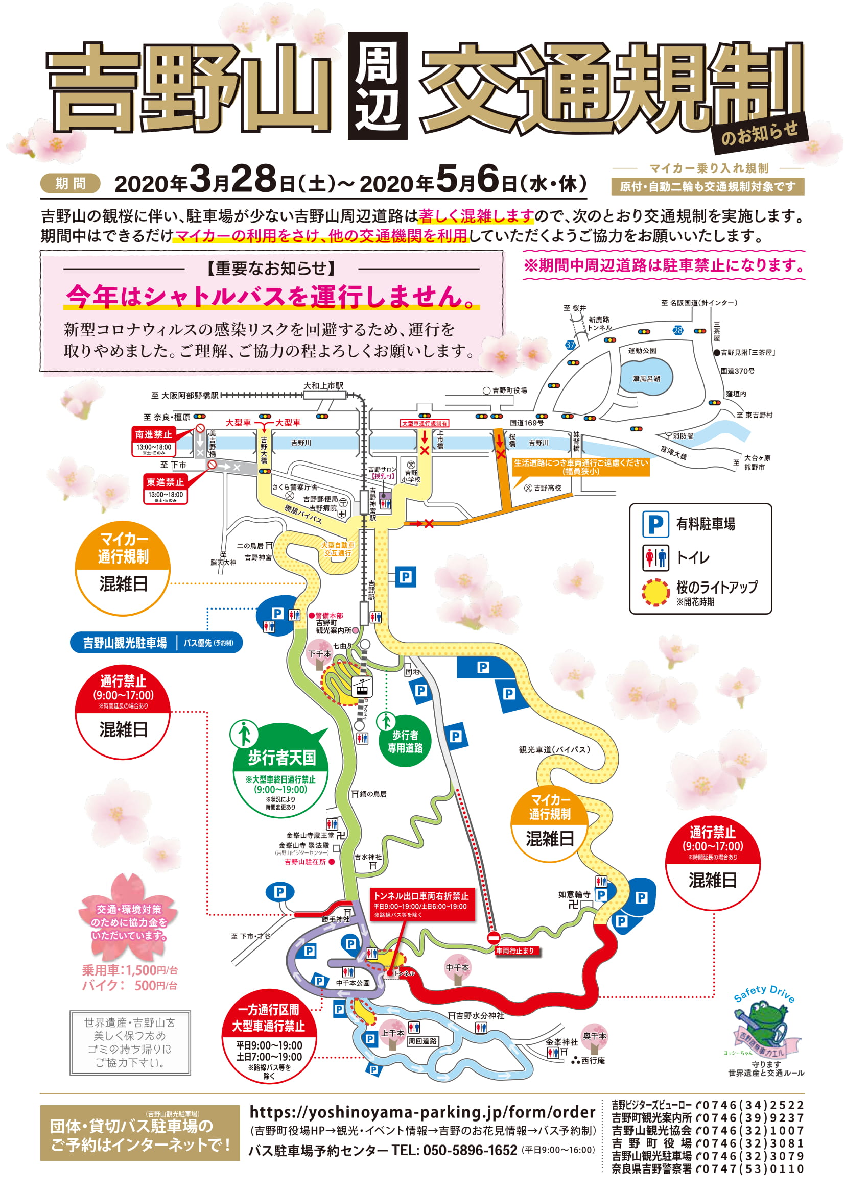 吉野山の観桜に伴い、駐車場が少ない吉野山周辺道路は著しく混雑しますので、通年通り交通規制を実施致します。