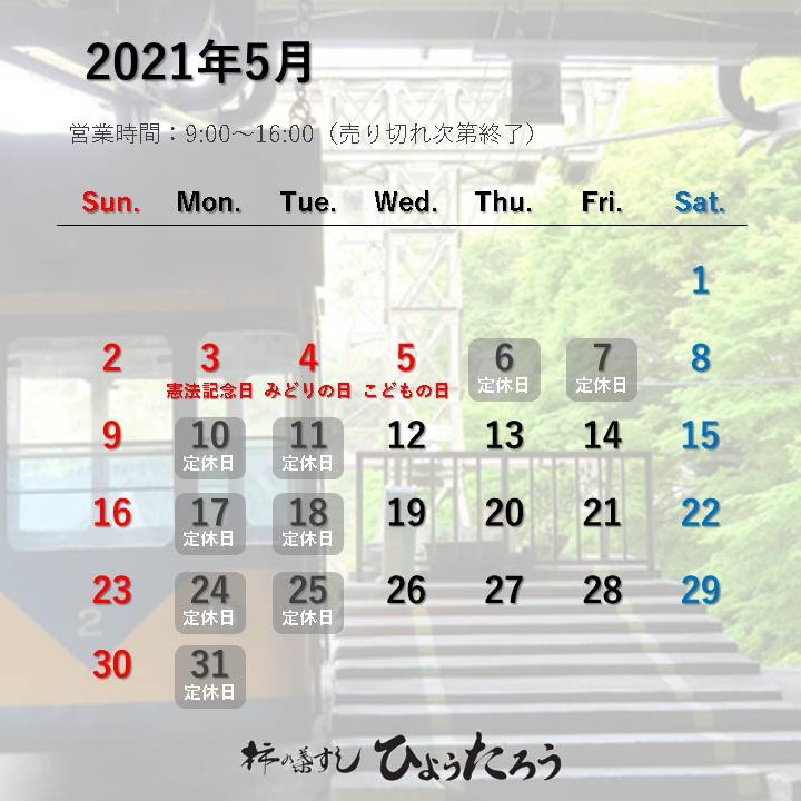 5月は、通常の月曜日定休に加えて、火曜日もお休みさせていただきます。