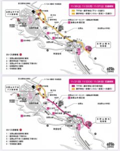・実証実験期間中、地元では歩行者天国や一方通行などの各種交通規制が行われます。