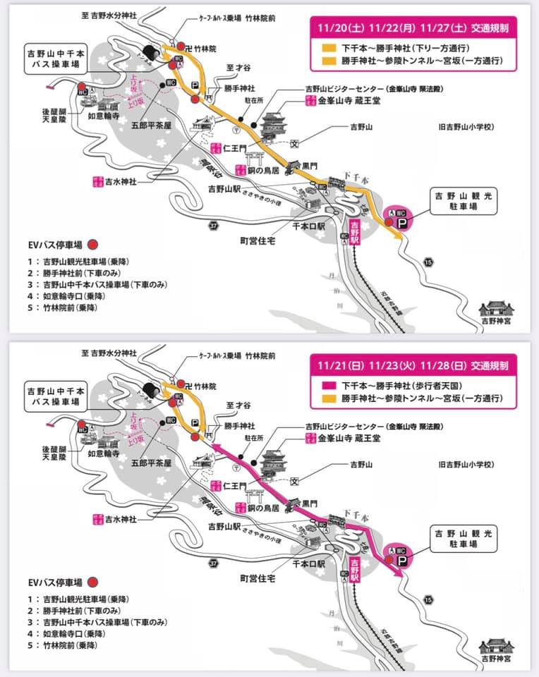 2021.11.14吉野町と環境省では、吉野山における地域観光課題の解決や地域の脱炭素化の促進に向けた検討のために、2次交通システムとしての周遊電気バス(以下、EVバス)の試験導入及びそれに対応した各種マイカー規制を含む実証実験を行います。