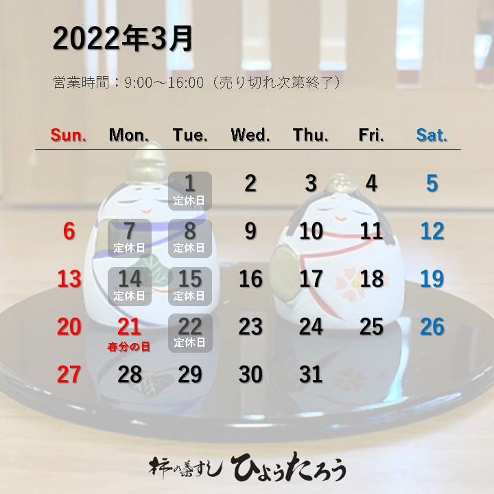 2022年3月の営業日をお知らせ致します。