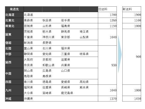 北海道、沖縄県への送料は値上げさせていただくことになりますが、それ以外の地域への送料は少しではありますが、値下げ致しました。