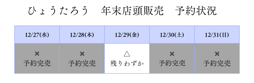 先ほど、12月30日(土)分の予約が埋まりましたので、年内は残り1日となります。