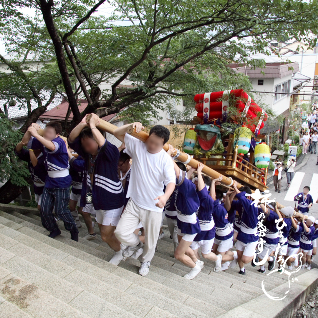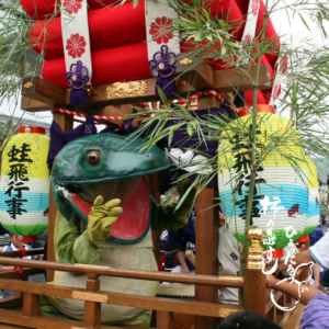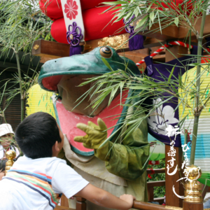 町中を練り歩く太鼓台の上に乗った主役の大蛙が、大きな動きで担ぎ手をふるい立たせたり、