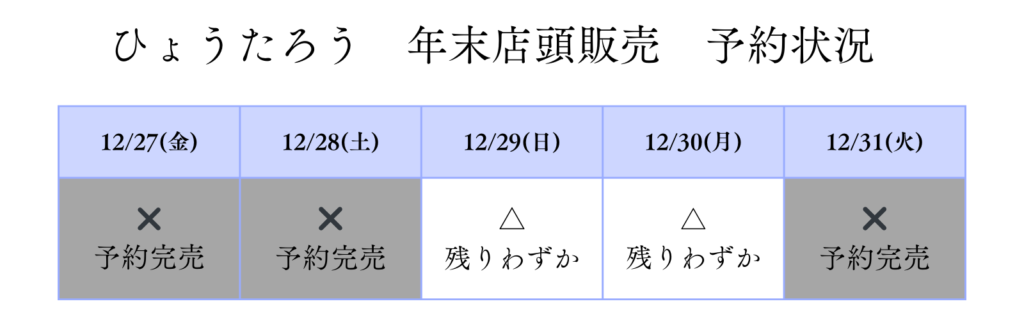 2024年12月18日(水)14:00時点の、年末の事前予約制期間の受付状況は以下の通りとなります。