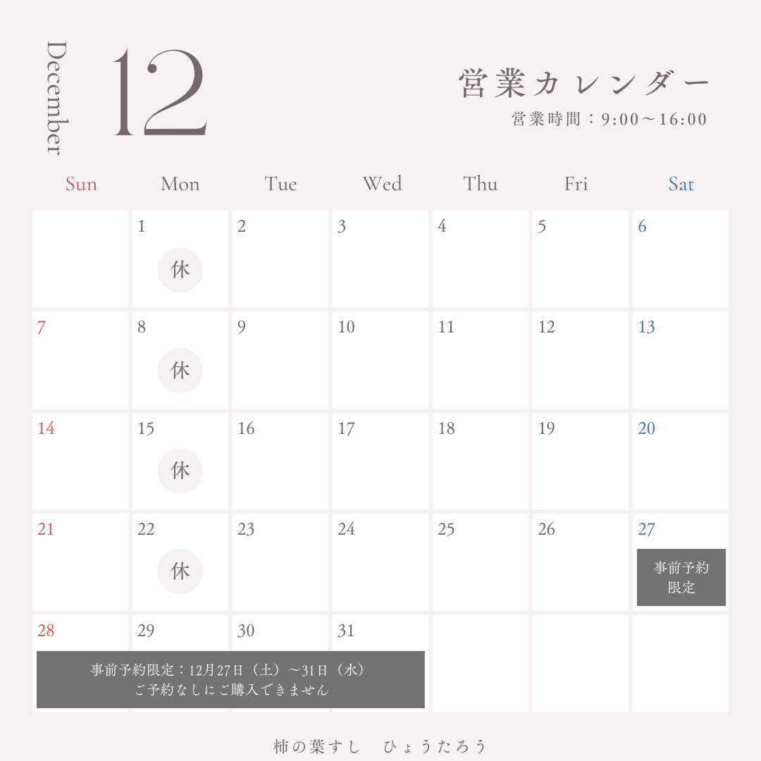 12月27日(土)~31日(水)は、事前予約限定での営業となります。